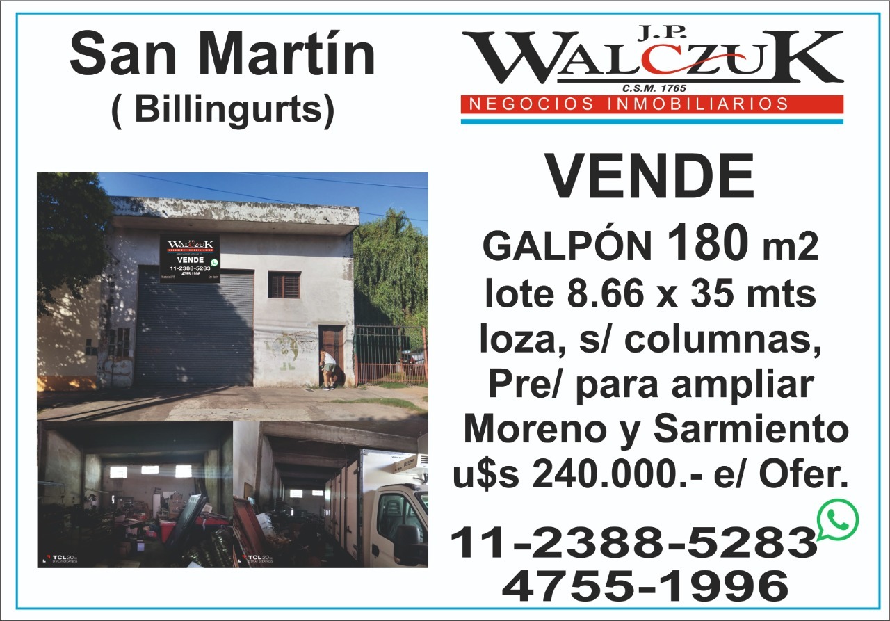 Galpón 180m2, lote 8.66 x 34 mts. losa buena altura, preparado para seguir construyendo, ubciado sobre calle Moreno al 3500, y Guido Spano, Billinghurst, San Martin, zona industrial.